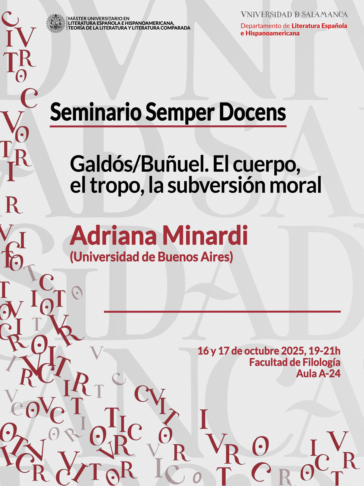 La semana pasada se celebró en el contexto de este máster el seminario «Galdós/Buñuel. El cuerpo, el tropo, la subversión moral», que impartió la profesora Adriana Minardi, de la Universidad de Buenos Aires.