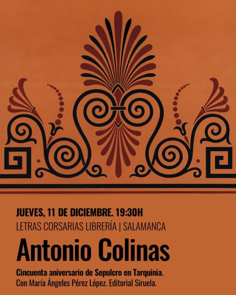 11 de diciembre: Presentación del libro Sepulcro en Tarquinia (50 aniversario) de Antonio Colinas por Mª Ángeles Pérez López